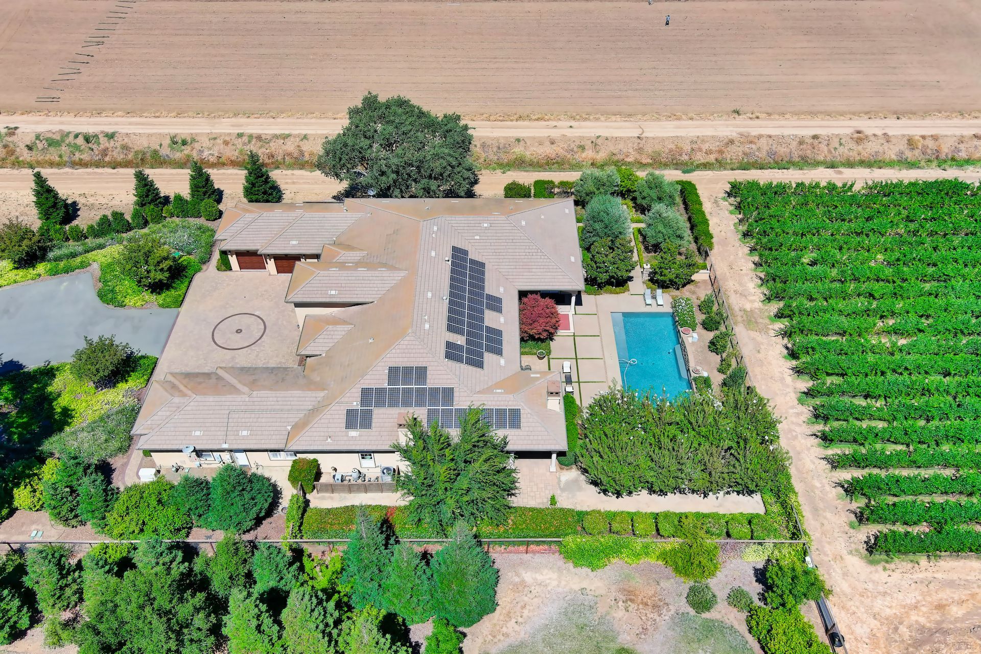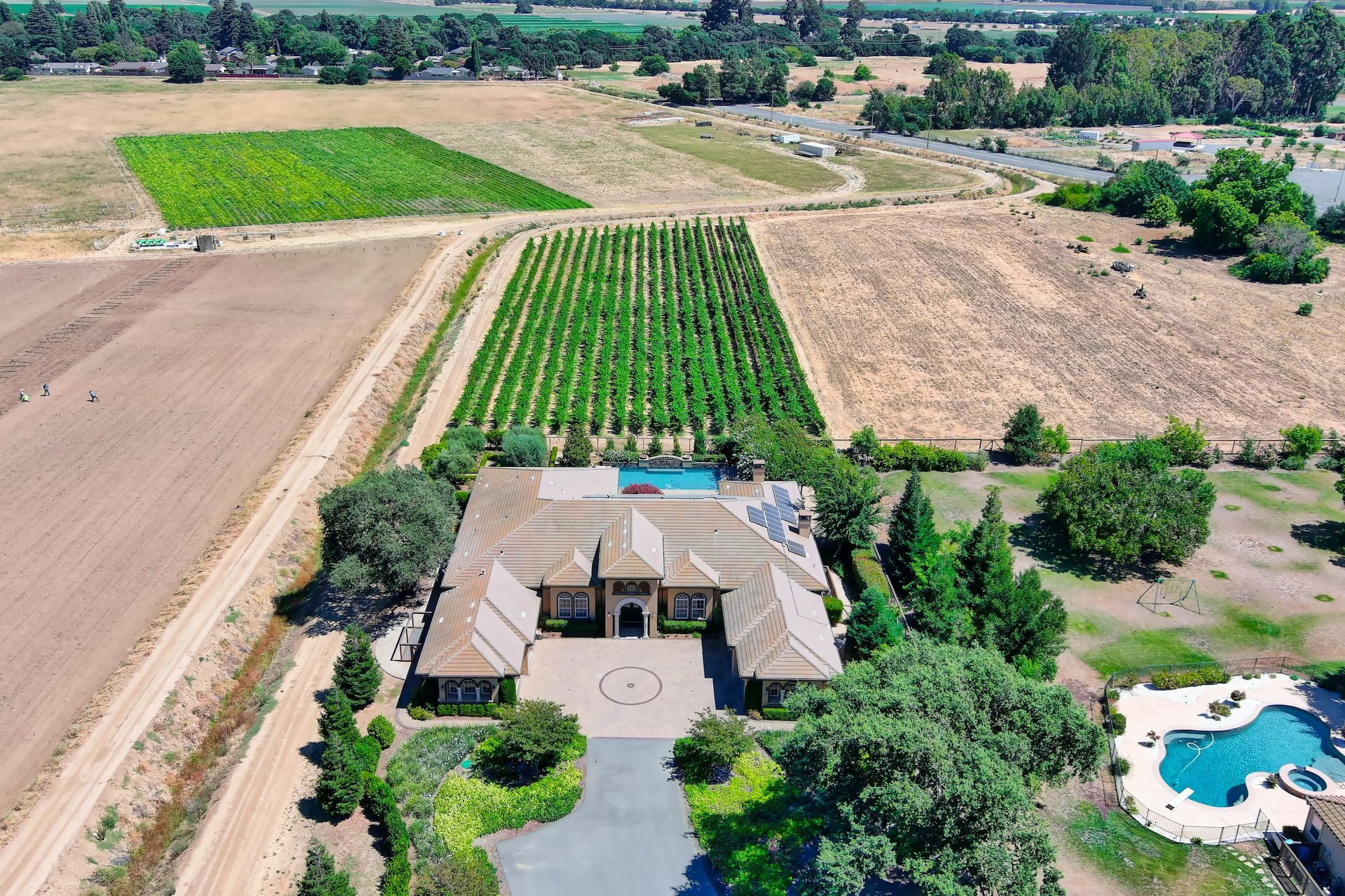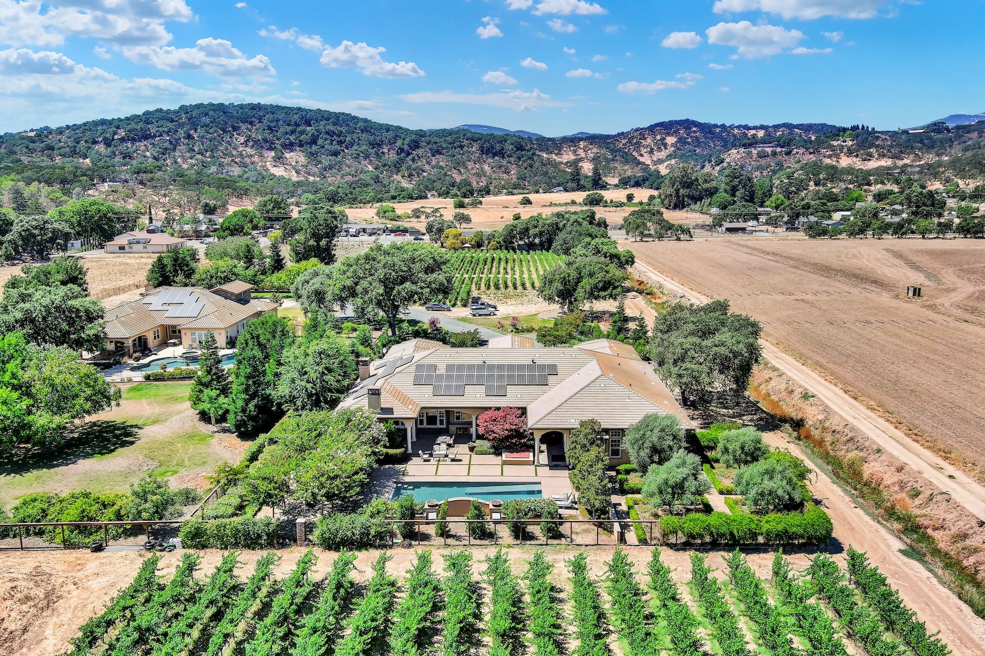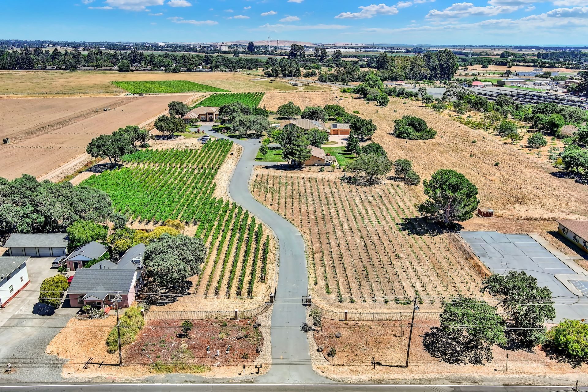 Wake up on vacation everyday on this 3.63 acre Mediterranean Villa. Surrounded by 3 acres of Cabernet grapes, beautiful olive trees and views of the surrounding hills. This home is a sprawling 6,100 single story that offers 4 bedrooms all with ensuites. The Primary bedroom is extra special overlooking both the vineyards and swimming pool, with a cozy fireplace and sitting area. The cathedral ceilings and tall windows bring in the natural light. A media/game room is perfect for indoor entertaining, while the outside swimming pool and jacuzzi make for great gatherings with friends and family. Working from home is a treat with dual working areas and views of the vineyards lining the gated entrance to the property. Invite friends for a weekend of wine tasting at Caymus Suisun, 360 Vineyards or a car show and tasting at the recently opened Bally Keal Estate. Suisun Valley is an emerging destination